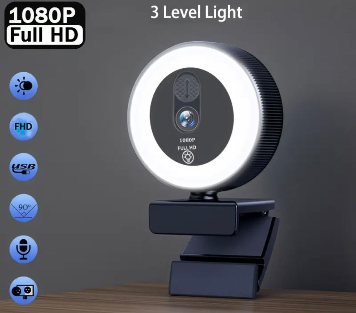Caméra USB 4K Ultra HD | Mise au Point Automatique + Éclairage Annulaire à 3 Niveaux + Cache de Confidentialité Coulissant + Support/Pied Rotatif à 360° + Adaptateur Type-C Plug & Play | Chat Vidéo/ Conférence/Diffusion en Direct/Apprentissage en Ligne